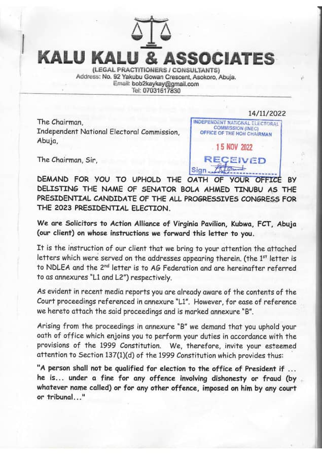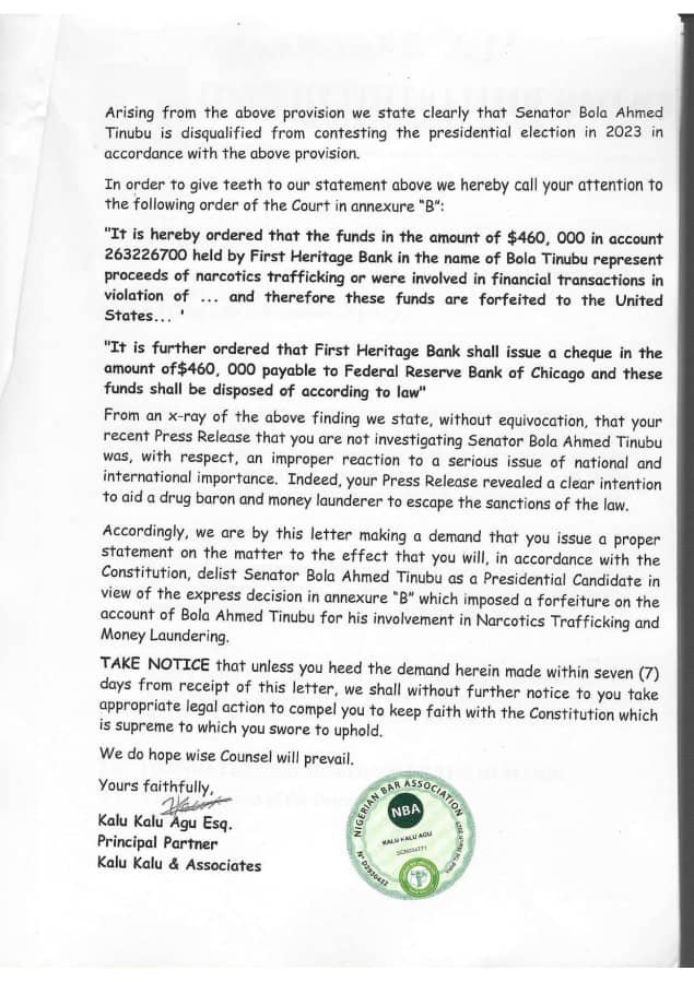 “Accordingly, we are by this letter making a demand that you issue a proper statement on the matter to the effect that you will, in accordance with the Constitution, delist Senator Bola Ahmed Tinubu as a Presidential Candidate in view of the express decision in annexure “B” which imposed a forfeiture on the account of Bola Ahmed Tinubu for his involvement in Narcotics Trafficking and Money Laundering.